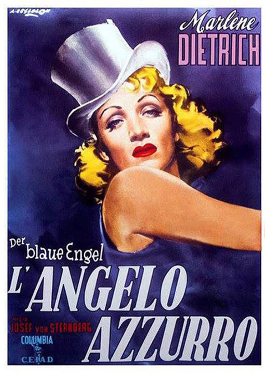 Sul manifesto de "L'Angelo Azzurro" domina la figura iconica di Marlene Dietrich come Lola Lola, avvolta in un'atmosfera decadente e sensuale. Con colori intensi e pose provocanti, il design riflette il dramma e la seduzione del film diretto da Josef von Sternberg, capolavoro del cinema tedesco.