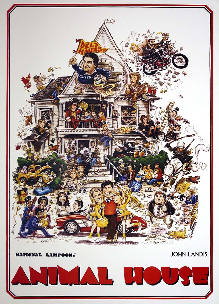 Sul manifesto di "Animal House" domina un'illustrazione caotica e comica che cattura l'essenza della folle vita universitaria. Personaggi eccentrici, feste sfrenate e l'irriverenza della confraternita Delta Tau Chi emergono. Una celebrazione della ribellione diretta da John Landis, con John Belushi protagonista.