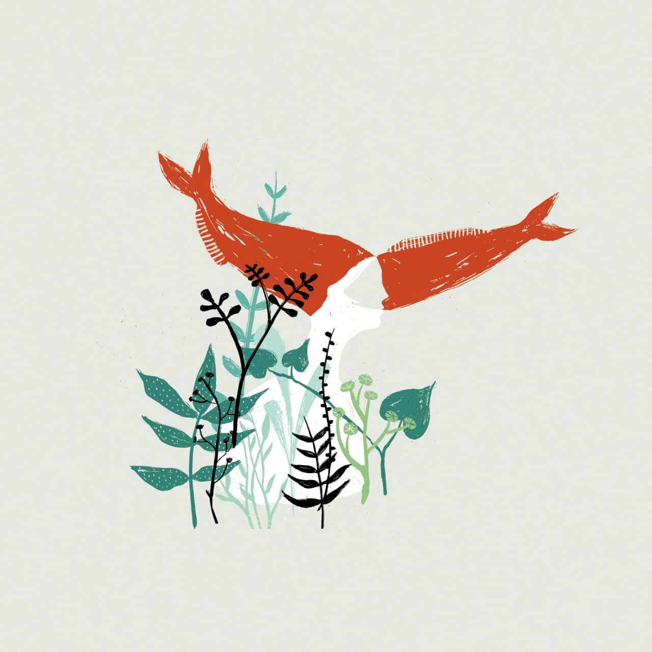 Code di pesce di Elisa Talentino è un'opera che raffigura due code di pesce si intrecciano in un abbraccio subacqueo, formando il profilo etereo di un volto femminile al centro. Intorno, un'esplosione di piante acquatiche: foglie verdi, felci nere e steli turchesi emergono dal fondo mela pallido, evocando un mondo marino rigenerante e misterioso.