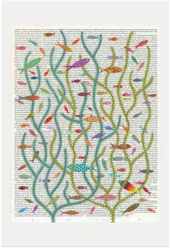 Questa opera di Chiara Passigli presenta dei pesci di varie dimensioni che nuotano intorno a coralli. Come in ogni sua opera un'attenzione particolare è riservata alla parola scritta: le pagine di vecchi libri diventano lo sfondo delle opere. Stampato su Carta Innova Etching Cotton Rag 100% cotone 315 g