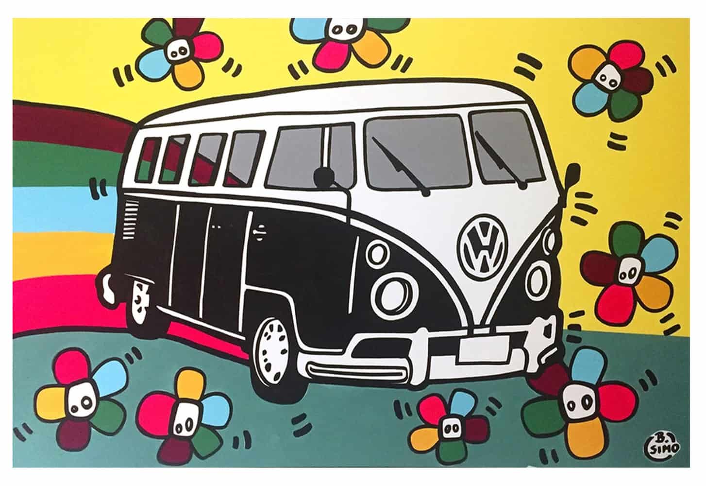 Flowers Power di B.simo ritrae un pulmino Volkswagen retrò, circondato da fiori stilizzati, simboleggiando la fusione tra libertà, nostalgia e energia naturale in chiave psichedelica. Misure 140x 100 cm tecnica acrilico su tela