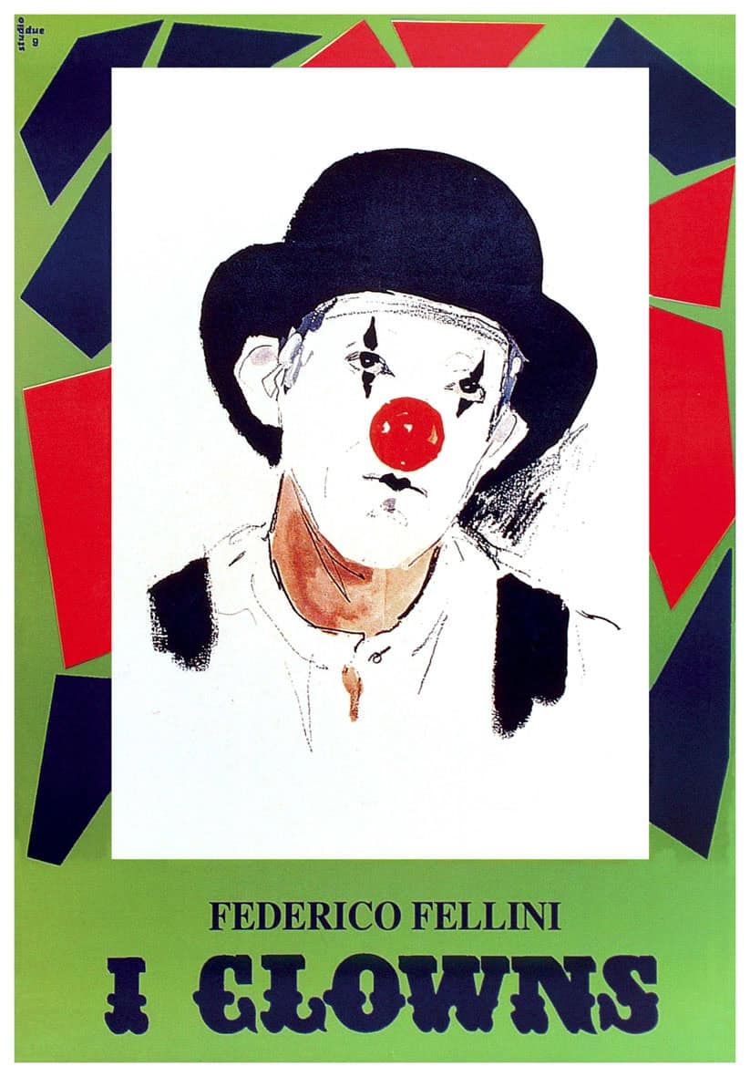 l manifesto de I Clowns di Federico Fellini presenta una figura di clown stilizzata su fondo essenziale, dai tratti espressivi e malinconici. L'immagine, semplice ma evocativa, riflette il tono poetico e surreale del film, esplorando il mondo del circo tra memoria, identità e maschere della vita.
