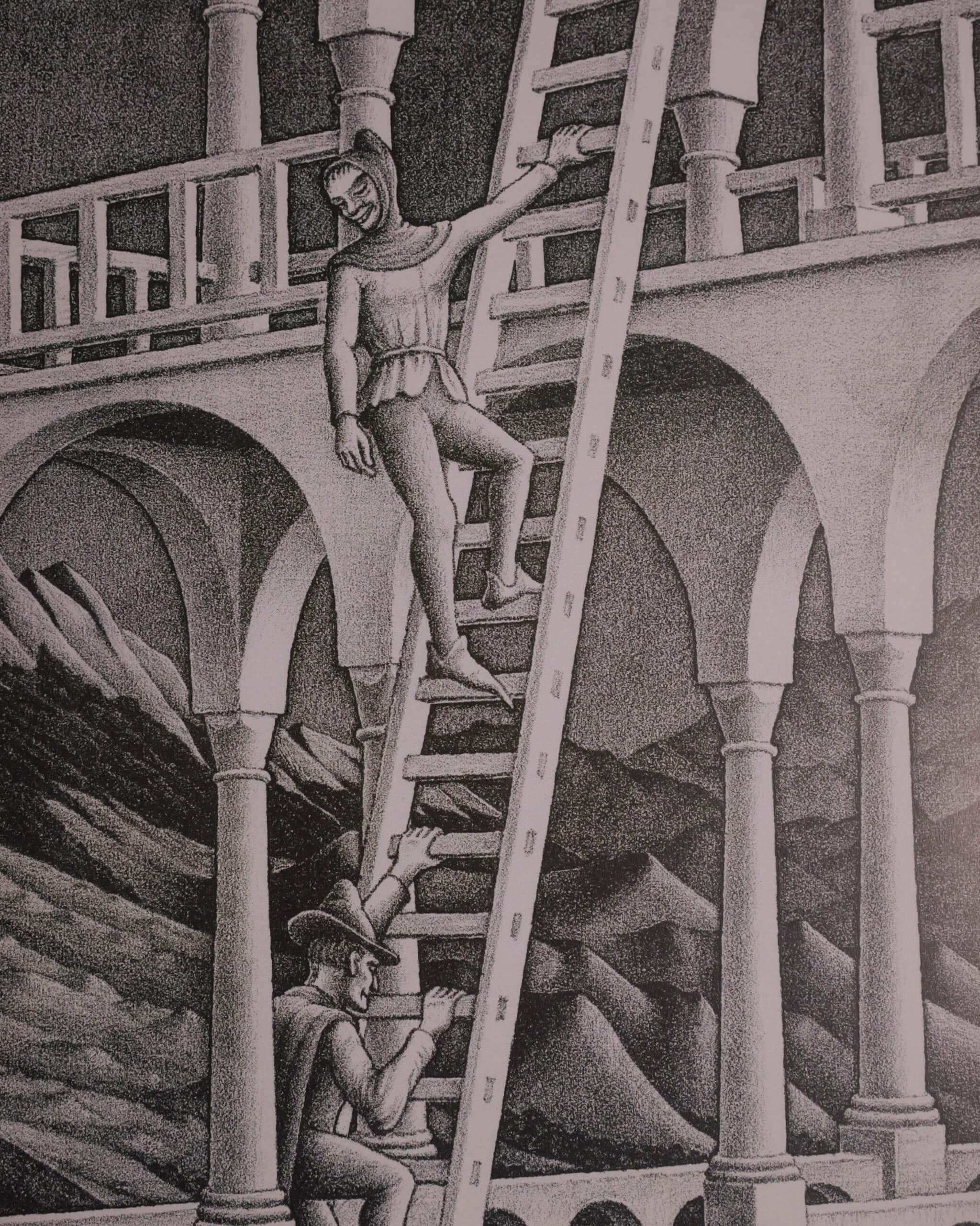 Belvedere (1958) di M. C. Escher è una litografia che sfida la logica prospettica. Mostra un edificio impossibile con colonne che si incrociano in modo paradossale. Una figura in primo piano tiene un cubo irrealizzabile, enfatizzando l'illusione. L’opera esplora la percezione e i limiti della realtà.