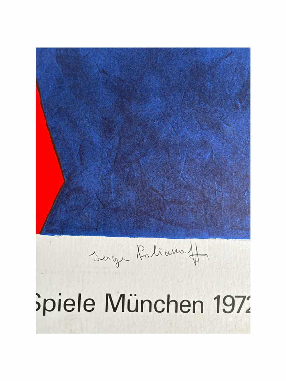 Realizzato con il tipico linguaggio cromatico e strutturale di Poliakoff, il poster combina forme sovrapposte nei toni del blu, rosso e nero creando un ritmo visivo armonioso e dinamico. Firmato in stampa in basso a destra, l’opera riflette lo spirito innovativo e internazionale della serie di manifesti commissionati per celebrare le Olimpiadi di Monaco, unendo arte moderna e movimento atletico