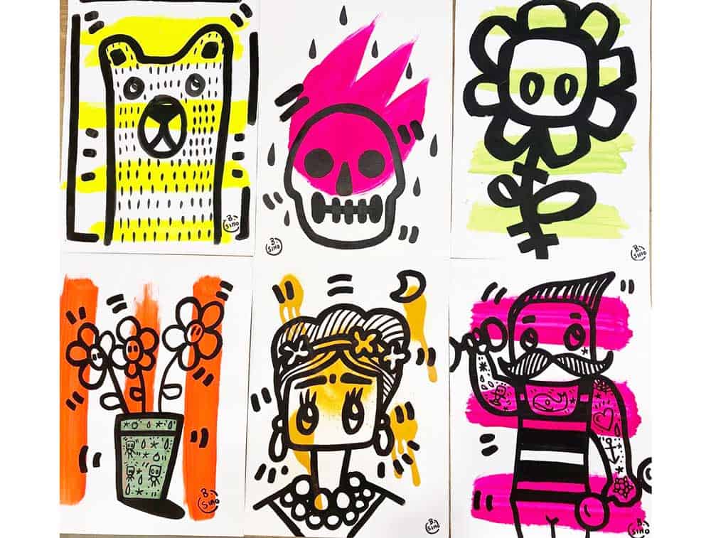 Le opere su carta con realizzate con tecnica mista di B.Simo raffigurano i suoi personaggi più iconici, realizzati con uno stile pop unito a influenze graffiti e street art. L’artista mescola linee grafiche decise, pennellate gestuali e colori vivaci, creando figure piene di energia, personalità e ironia, in cui il linguaggio urbano incontra la creatività giocosa tipica del suo universo visivo.