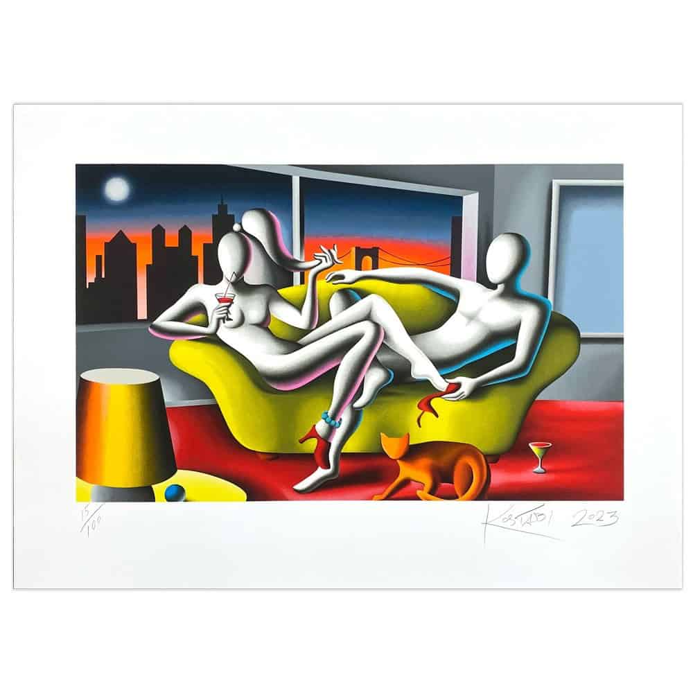Perfection at Twilight di Mark Kostabi ritrae due figure iconiche senza volto, simbolo dell’uomo moderno in una società complessa, capaci però di trasmettere una profonda connessione emotiva e complicità di coppia. La scena è ambientata in un contesto domestico surreale, con uno skyline urbano sullo sfondo, che conferisce all’opera un’atmosfera enigmatica e metafisica, tipica del linguaggio simbolico di Kostabi.