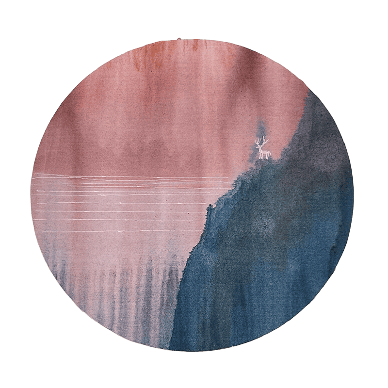 Opera di Franco Luppis dal formato rotondo che crea un paesaggio zen minimale, con il cervo posizionato sulla linea di demarcazione tra due emisferi cromatici. Pezzo unico realizzato per L'Image. Firmata sul retro.