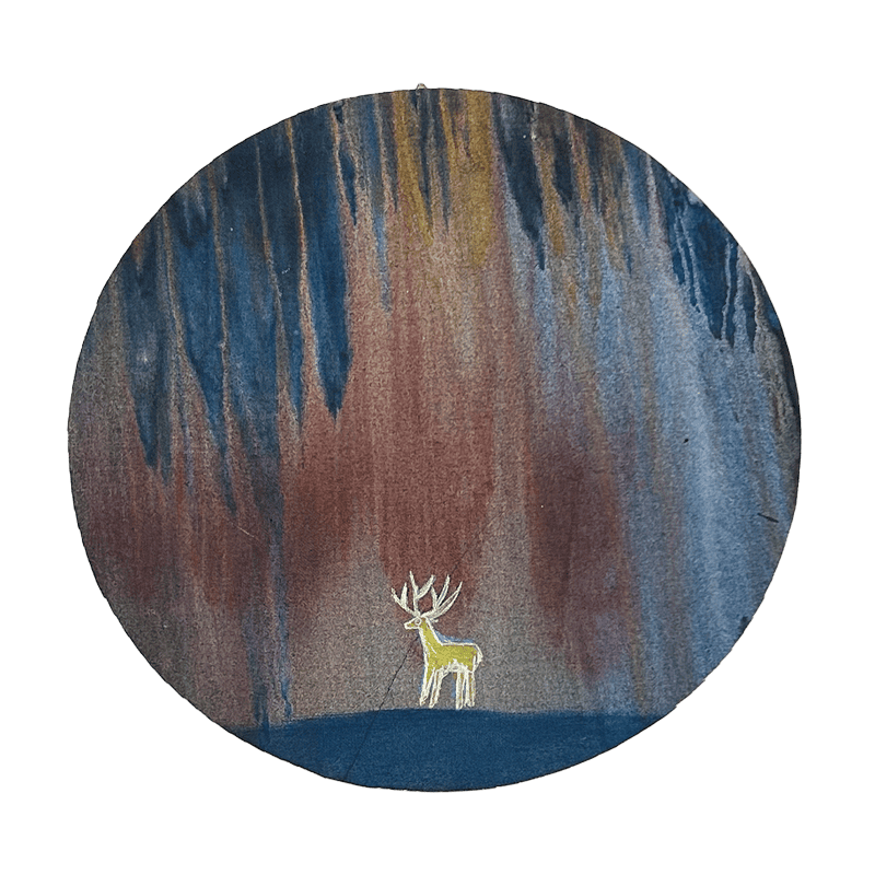 Opera di Franco Luppis dal formato rotondo che crea un effetto di aurora avvolgente, con il cervo posizionato centralmente in basso come fulcro. Lo sguardo sale dalle sue corna verso le colature verticali che dominano lo spazio come cortine luminose. Pezzo unico realizzato per L'Image. Firmata sul retro.