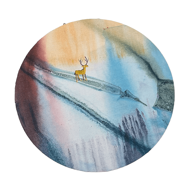 Dipinto di Franco Luppis dal formato rotondo che crea un effetto di viaggio diagonale, con il cervo posizionato centralmente sul sentiero grigio come fulcro dinamico. Pezzo unico realizzato per L'Image. Firmata sul retro.