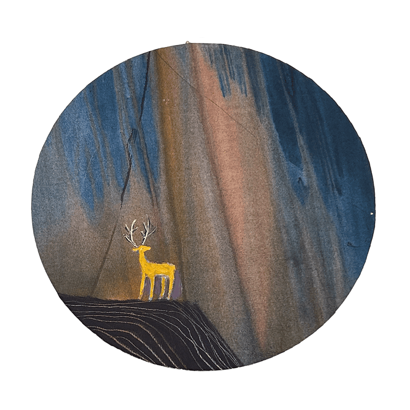 Tela circolare di Franco Luppis che raffigura un cervo dorato luminoso su un crinale roccioso sotto un cielo aurorale. Pezzo unico realizzato per L'Image. Firmata sul retro.
