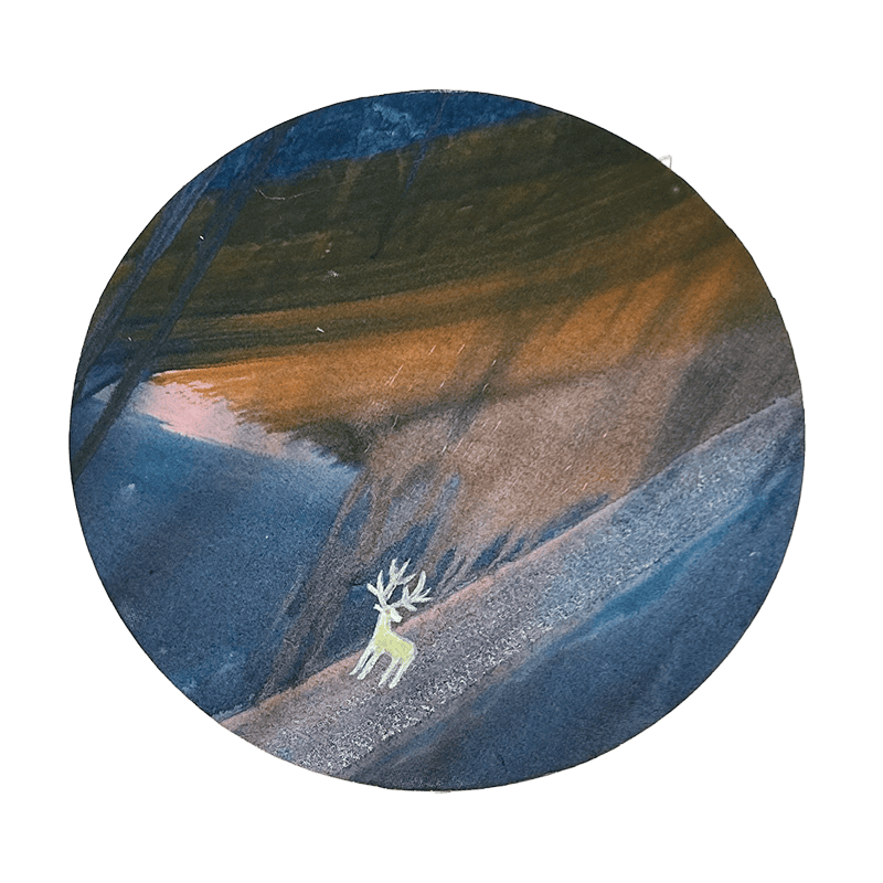 Tela circolare di Franco Luppis raffigurante un cervo posizionato centralmente sul sentiero grigio come guida. Lo sguardo segue la linea diagonale dal basso verso l'alto, verso l'orizzonte luminoso. Pezzo unico realizzato per L'Image. Firmata sul retro.