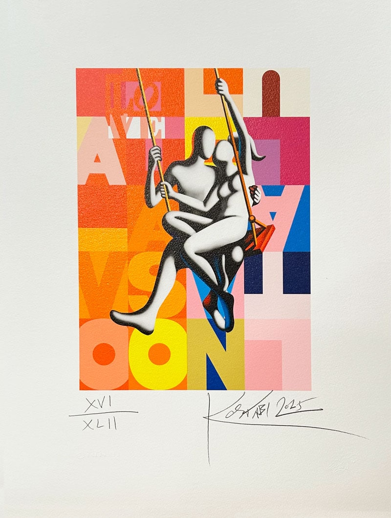 The Language of Love di Mark Kostabi ritrae una coppia senza volto che si abbraccia, sospesa su un’altalena, immersa in uno sfondo di lettere colorate. L’opera trasmette intimità, complicità e leggerezza, trasformando il gesto dell’abbraccio in un simbolo universale di comunicazione emotiva e amore, tipico del linguaggio visivo distintivo di Kostabi.