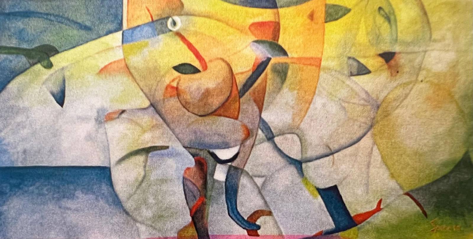 L'opera "Tromba d'aria con mela" di Pietro Spica gioca con il paradosso tra la forza distruttrice della natura e la quiete sospesa di un oggetto quotidiano. Dimensioni 70x138 cm
